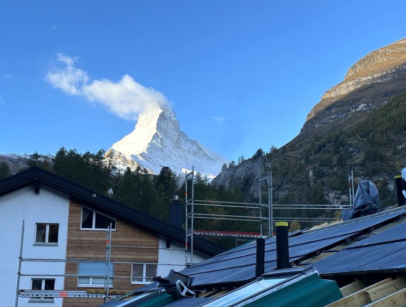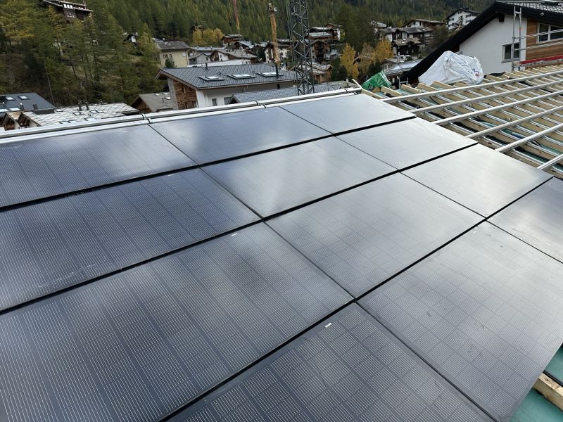 Die Montage der 91 Hybridmodulen in dieser Jahreszeit in solchen Höhenlagen ist eine Herausforderung. Das Steildach ist Morgens oft mit Reif belegt. Dafür entschädigt der schöne Blick auf das "Horu".