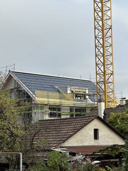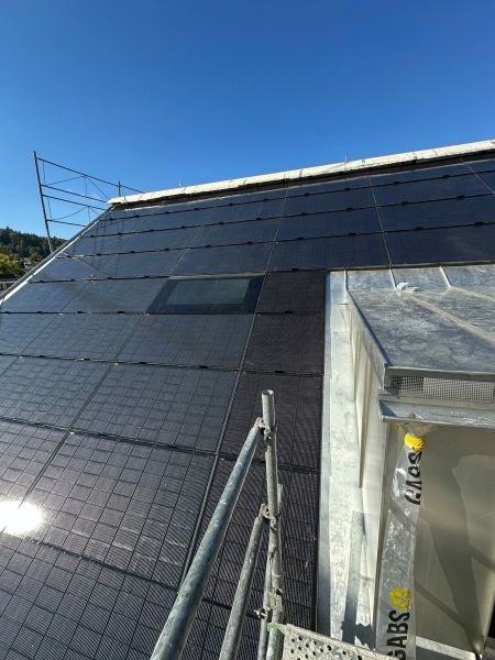 In Oberrieden am Zürichsee erstrahlt ein neues schwarzes Steildach – vollständig integriert und mit einer auf die Dachfenster abgestimmten Modulanordnung.