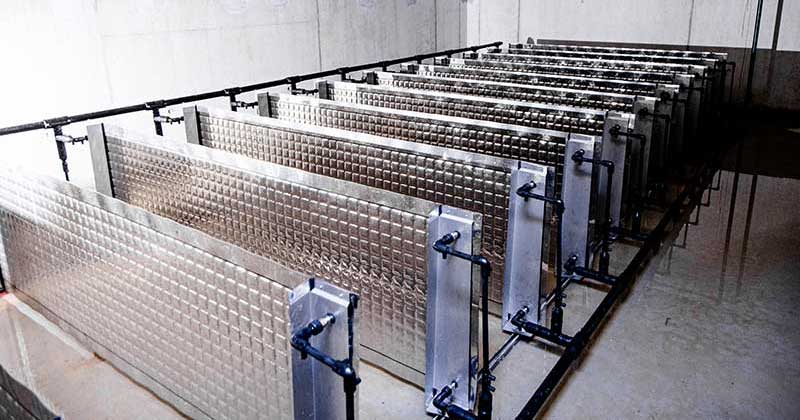 Am Boden des Eisspeichers sind vollflächig durchströmte Chromstahl-Wärmetauschern angebracht.